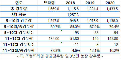 짧은 기간이지만 기후변화를 알 수 있는 내용은 강우량 보다는 일조량이라고 생각되는데 아쉽게 일조량 데이터는 획득하지 못했다.