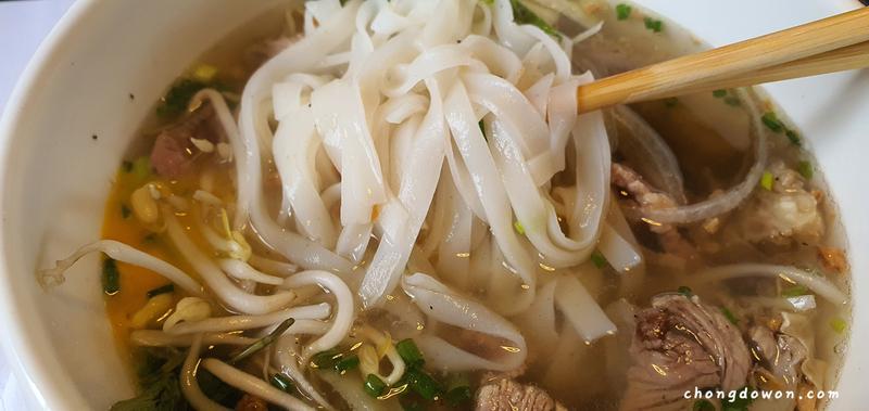 프놈펜에 있는 포 포츈과 로고가 같지만 국물맛과 면 스타일이 달라서 같은 브랜치인지는 정확하지 않다. 국물이 짜지도 달지도 않아서 좋은데 넓고 두꺼운 면을 써서 호불호가 갈릴 수 있다. 두꺼운 면인데도 적게 삶아줘서 설익은 면을 먹었다. 일반 국수가 2.5불로 싼 편이다. 대신 냉수 등은 따로 돈 받는다. 사진은 스페셜로 4불
