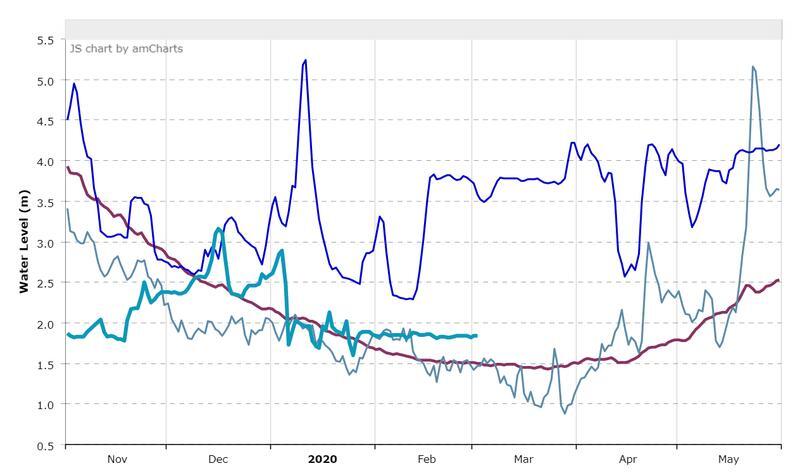 아래 이미지들은 메콩강위원회에서 제공하는 연도별 강수위변화다. Chian saen은 upper mekong, Vientien은 middle mekong Prek Kdam 은 low mekong에 해당하는 지역이다. 상류지역의 2019년과 2020년의 강수위는 전체 평균에 가깝지만, 하류지역은 수위가 많이 낮아지고 있다.