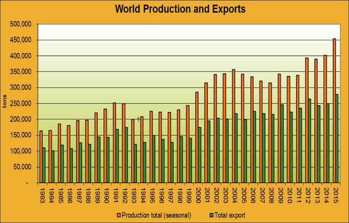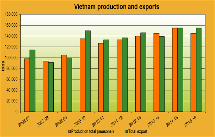 2014년 세계 후추 총 생산량은 409,000톤이고 2015년은 454,000톤이다. 베트남은 2014년에 155,000톤을 생산하여 총생산량의 38.6%를 차지했다. 인도는 지난 6년간 계속 생산이 감소했지만 2014년 45,000톤에서 2015년 85,000톤으로 증가했는데 좋은 기상으로 재배면적이 증가했기 때문이다.