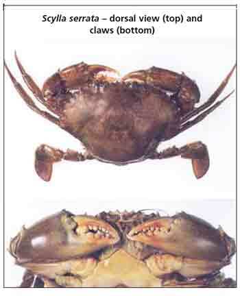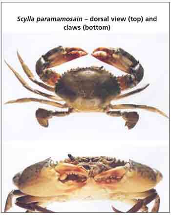 Juvenile crab – A miniature version of the adult, it is about 4 mm wide. About a month after hatching, when 10 – 20 mm wide, it moves to an estuary and settles in a sheltered area.