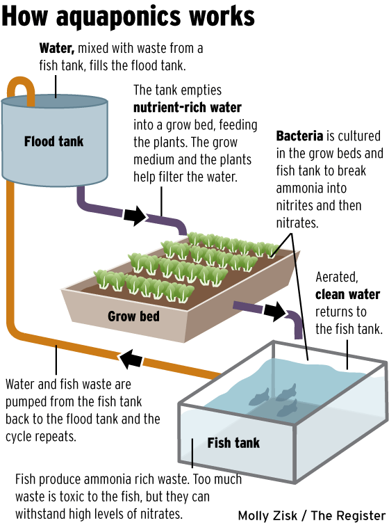 아쿠아포닉은 어항의 물고기 분뇨를 질소화시켜 상단에 있는 화분에 공급하고, 상단의 화분에서는 산소를(물을 통해) 어항으로 공급시켜주는 시스템이다.