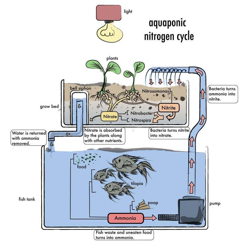 아쿠아포닉은 어항의 물고기 분뇨를 질소화시켜 상단에 있는 화분에 공급하고, 상단의 화분에서는 산소를(물을 통해) 어항으로 공급시켜주는 시스템이다.