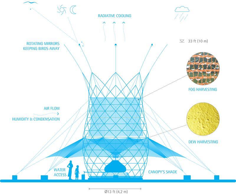 미세구멍이 있는 나일론섬유가 안개를 포집하고, (일반적으로 사막에서 수증기를 포집하듯) 수증기 포집장치가 아래에 또 있어서 두번 물기를 잡아준다. 그리고 모인 물들은 중앙 아래의 단지에 집중되고 사람들은 편안하게 물을 가져가면 된다.