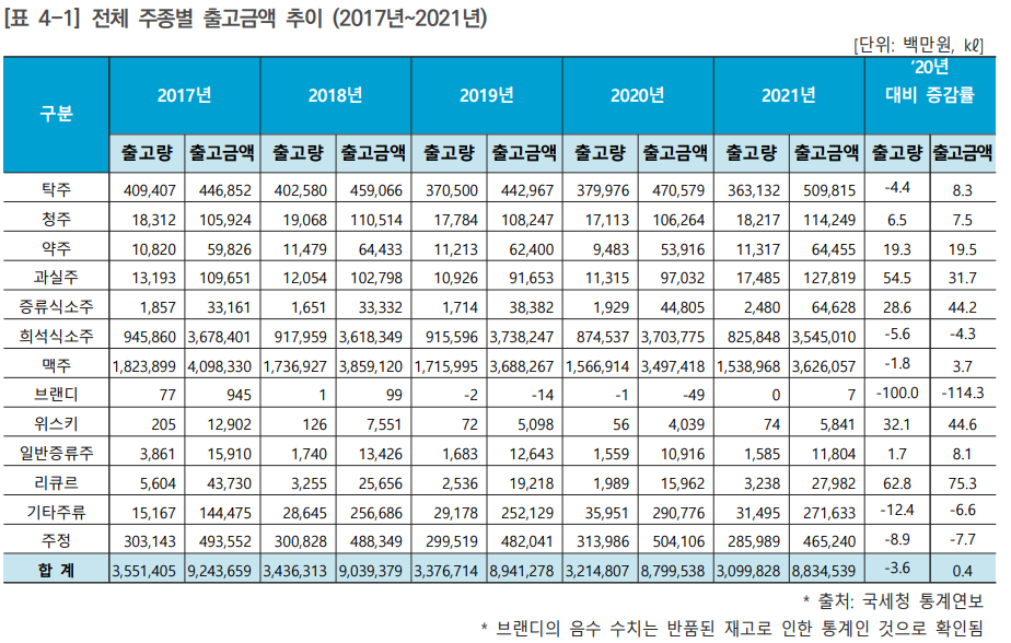 약주, 과실주, 증류식 소주 등의 주류 출고가 비약적으로 증가하고 있음을 알 수 있다.