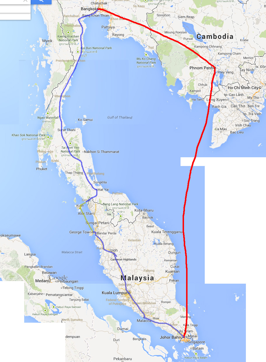 이번 여행은 조금 무리가 되더라도 동남아 국가에 거주하는 이점을 살려 인근 국가들을 한바퀴 돌아보기로 했다. 그래서 우선은 태국 방콕으로 비행기를 타고 간 뒤, 열차와 페리를 이용하여 말레이시아 랑카위, 다시 버스를 이용해서 쿠알라룸푸르와 싱가폴을 본 뒤 비행기로 프놈펜으로 다시 돌아오는 일정이다.