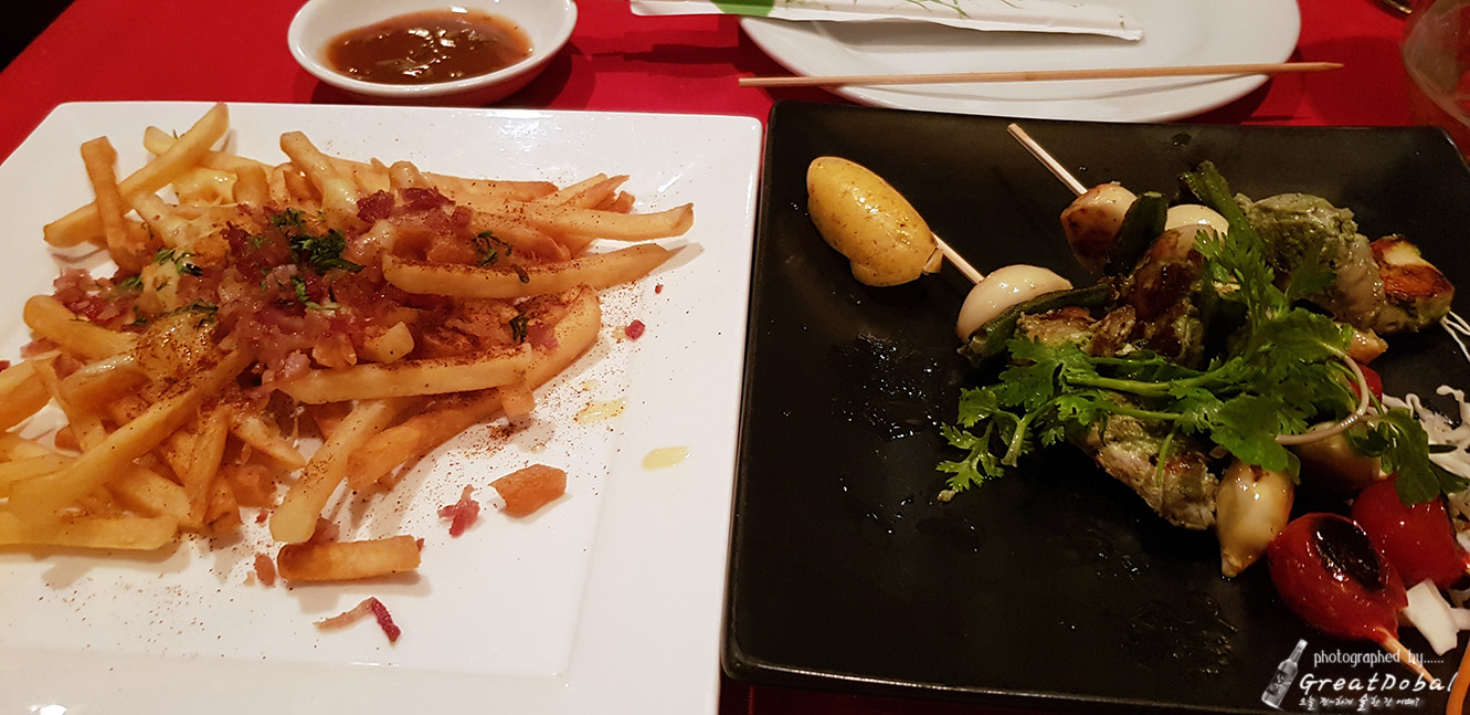 야경을 보기 위해 간Sakura Tower에서 맥주 피쳐 2개와 베이컨치즈감자튀김, 닭꼬치를 시켰다. 총 33,925ks(최소 주문은 7,000ks) 그간의 경험으로 예상은 했지만 감자, 베이컨, 치즈를 한데 섞어 놓고도 맛이 없었다. 야경만 아니면 굳이 밥 먹으러 갈 필요는 없는 곳이다.