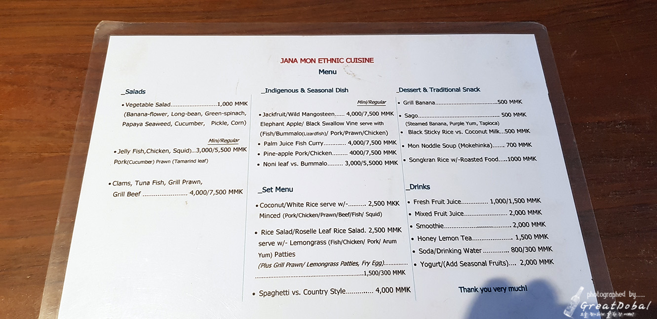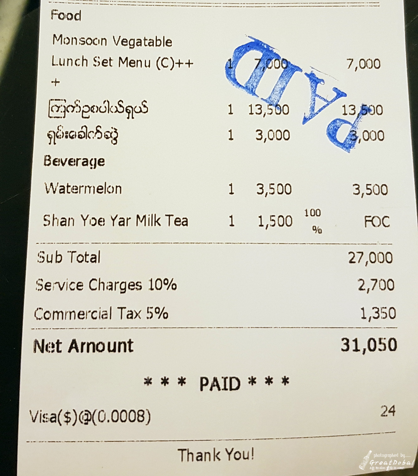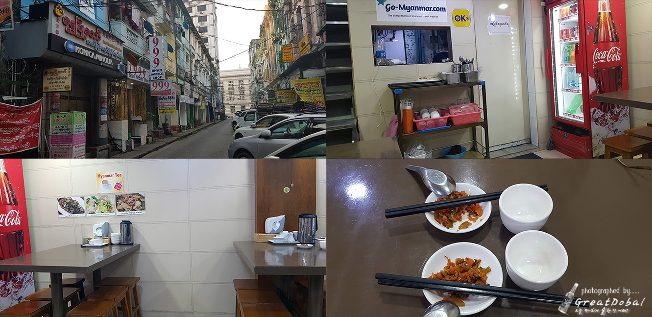 위치 구글지도 쉐다곤사원에서 도보 15분 정도 위치에 있는 식당이다. 미얀마 전통식이 깔끔하게 담겨져 나오고 특별히 뛰어난 맛은 아니지만 향신료가 강하지 않아서 누구나 쉽게 먹을 수 있다. 다만 음식들은 대체로 짜다. 동남아에서 흔히 볼 수 있는 커리치킨, 돼지고기 향신료 볶음, 찐새우, 채소+양념(젓갈류)인데 먹기 좋게 담겨져 있고, 잘 익혀져 있다. 음료 두잔과 물 한통을 포함해서 총 18,800ks