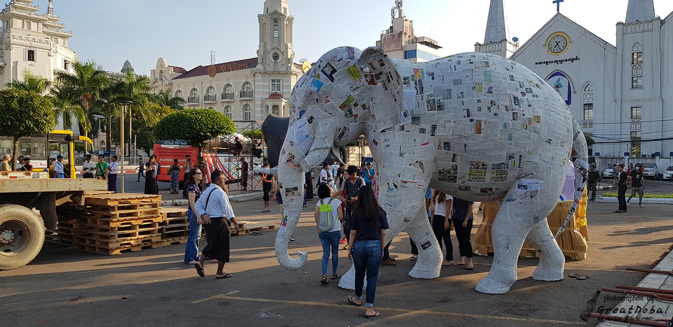 2. 반둘라 공원 : 술레 파고다 바로 길 건너에는 반둘라 공원이 있다. 마침 갔던 날 WWF국제야생동물기금에서 코끼리 상을 만들어 전시하는 행사를 진행하고 있었다.