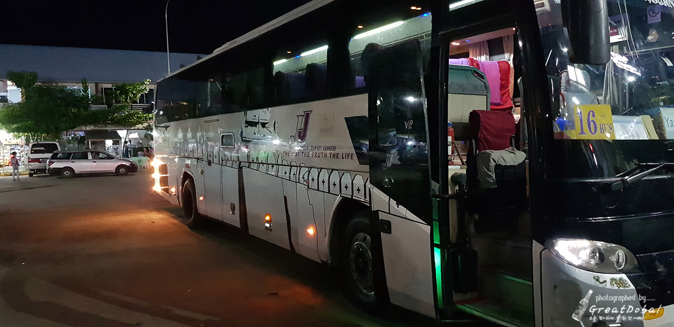 바간에서 양곤까지는 야간버스를 탔다. 2+2 좌석으로 슬리핑버스는 아니지만 의자가 충분히 뒤로 젖혀진다. 각각 담요도 제공한다. 제일 첫번째 좌석은 다리를 뻗을 수 없어서 불편하기 때문에 첫번째를 빼고 좌석을 선택하는 것이 좋다. 호텔을 알려주면 픽업차량이 와서 터미널까지 태워간다. 마찬가지로 양곤에서는 공항을 지난 뒤 픽업차량이 몇 군데 지정된 장소까지 태워준다.