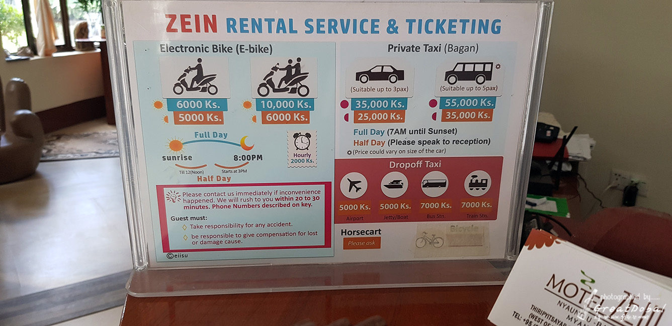 바간 시내에서는 오토바이도 많지만 E-bike도 흔히 볼 수 있다. 자전거로 다니기에는 조금 멀어서 e-bike를 빌려서 타면 편리하다. 2인용은 하루 종일 빌리는데 10,000ks 이다. 하루에 50km 정도 이동했는데 배터리는 충분했고, 혹시 배터리가 방전될 경우, 연락하면 와서 교체해 준다고 한다.