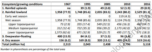 캄보디아 벼는 우기 고지대, 우기 저지대, 심수, 건기로 구분되며, Upland 벼는 대부분 캄보디아 북부, 북동부에서 재배된다. deep water 벼는 고지대보다 물이 깊은 호수 가장자리에서 재배된다. 퇴수재배 벼는 주로 메콩강과 바삭강의 낮은 부분에 집중되어 있다. 그 외 지역은 Rainfed lowland 벼로 뚠레삽 중심 유역과 메콩강, 바삭강의 하류에 집중되어 있다.