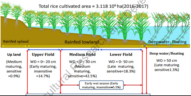 캄보디아 벼는 우기 고지대, 우기 저지대, 심수, 건기로 구분되며, Upland 벼는 대부분 캄보디아 북부, 북동부에서 재배된다. deep water 벼는 고지대보다 물이 깊은 호수 가장자리에서 재배된다. 퇴수재배 벼는 주로 메콩강과 바삭강의 낮은 부분에 집중되어 있다. 그 외 지역은 Rainfed lowland 벼로 뚠레삽 중심 유역과 메콩강, 바삭강의 하류에 집중되어 있다.
