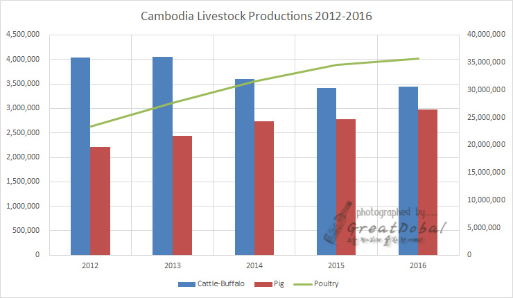 소와 물소의 입식은 증가한 것으로 나타나는데 이의 배경이 되는 근거는 알 수 없다. 다만 Household livestock에서 소는 0.22% 감소 물소는 3.39% 증가했고, Commercial Livestock에서는 소가 74.49%, 물소가 207.94% 증가했다. 상업축산물입식이 증가한 것은 최근 캄보디아에서 육류가공제품을 위한 입식이 아닌가 생각해 본다. http://greatdobal.egloos.com/5871591