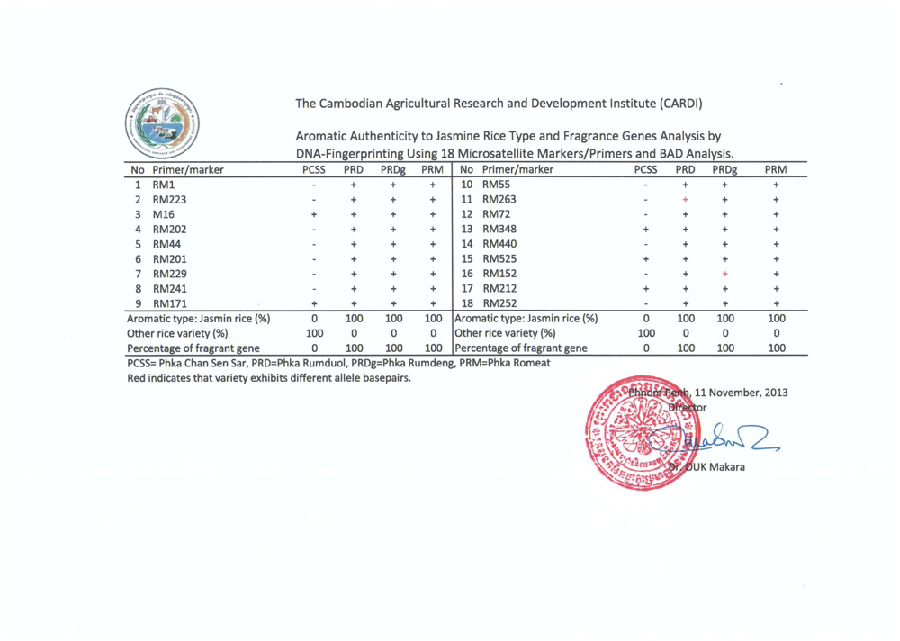 결론은 캄보디아에서 장려되는 향미쌀은 태국쌀과 유전적으로 구분하기 어렵다. 따라서 수출시장에서 캄보디아 쌀이 태국쌀로 둔갑하여 판매되는 현상이 자연스러운 일이라고 볼 수 있다.