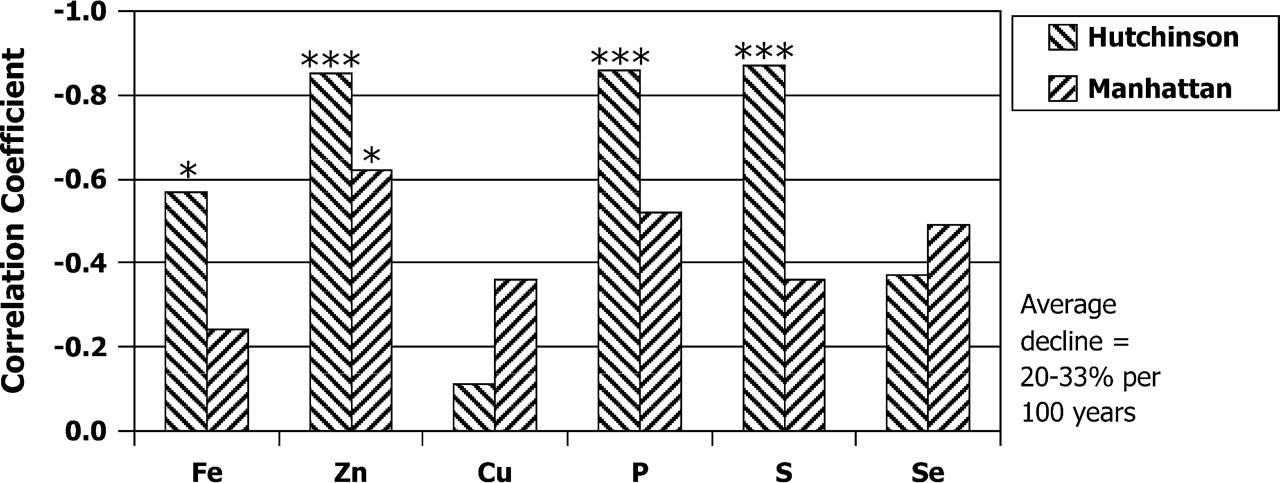 그래프를 보면 캔자스의 두 지역 허치슨과 맨하탄의 밀에서 100년간 양분 변화를 볼 수 있다. 아연, 인, 황에서 높은 부의 상관성으로 감소했음을 알 수 있다.