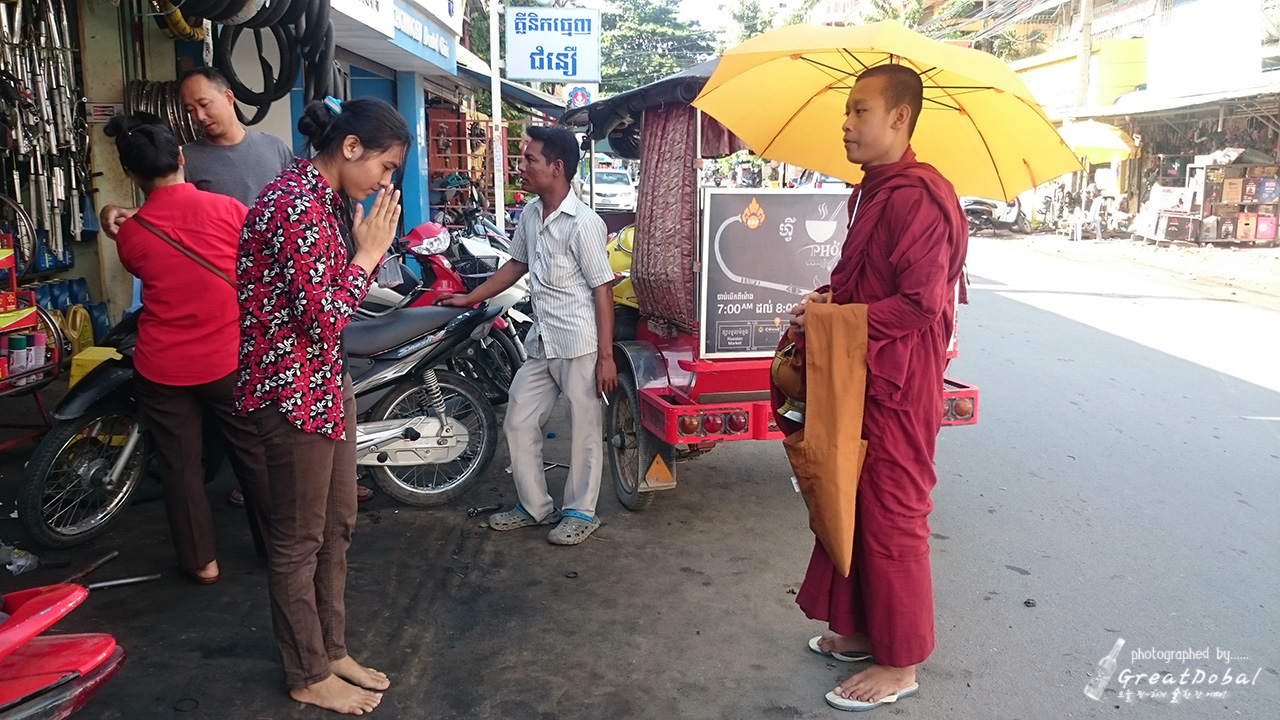 캄보디아에서 일상적으로 볼 수 있는 시주받는, 하는 모습
