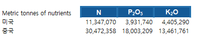 국별 작물별 비료 사용량을 보면 재미있는데 밀 벼 옥수수의 비료 사용량을 보면 중국은 32 34 38인데 인도는 16 34 4로 벼에 대한 비중이 높다. 반면 미국은 7 1 27로 옥수수에 대한 비중이 높고 유럽은 15 0 6으로 밀에 대한 비중이 높다. 그리고 미국은 대두가 19 유럽은 기타 곡물이 36 인도는 섬유작물이 35 중국은 근경류가 48로 각국의 식문화와 농산업의 근간을 옅볼 수 있다.