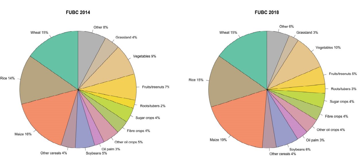 식량작물 위주로 설명은 했지만 전체 사용량을 보면 밀 156 벼 197 옥수수 214인 반면 오일팜 298 섬유작물 236 설탕작물 255 과일 232 채소 415로 유지와 섬유작물의 재배면적을 가늠해 볼 수 있다.