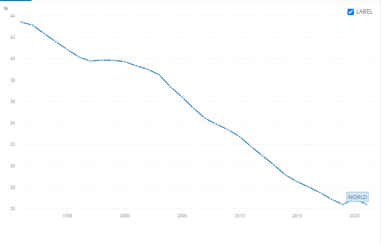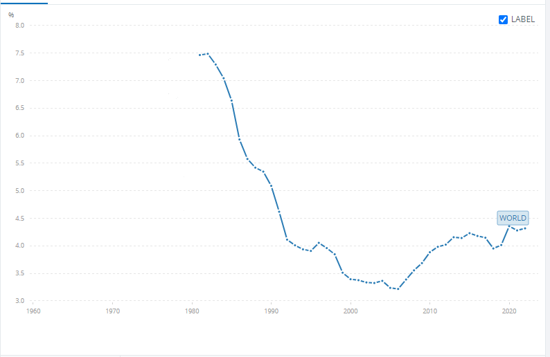농업인구 비중이 높은 상위 10개국과 G20 국가를 살펴봤다. 1991년 41%였던 농업인구는 2021년 26%로 감소했다. 1981년 농업생산(GDP)은 전세계 총 생산의 7.5%를 차지했지만 2022년에는 4.3%가 되었다.