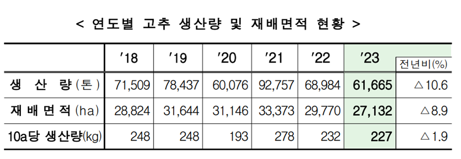 <표2. 캄보디아 고추 재배면적, 생산량 *FAOSTAT 11-20-2023>