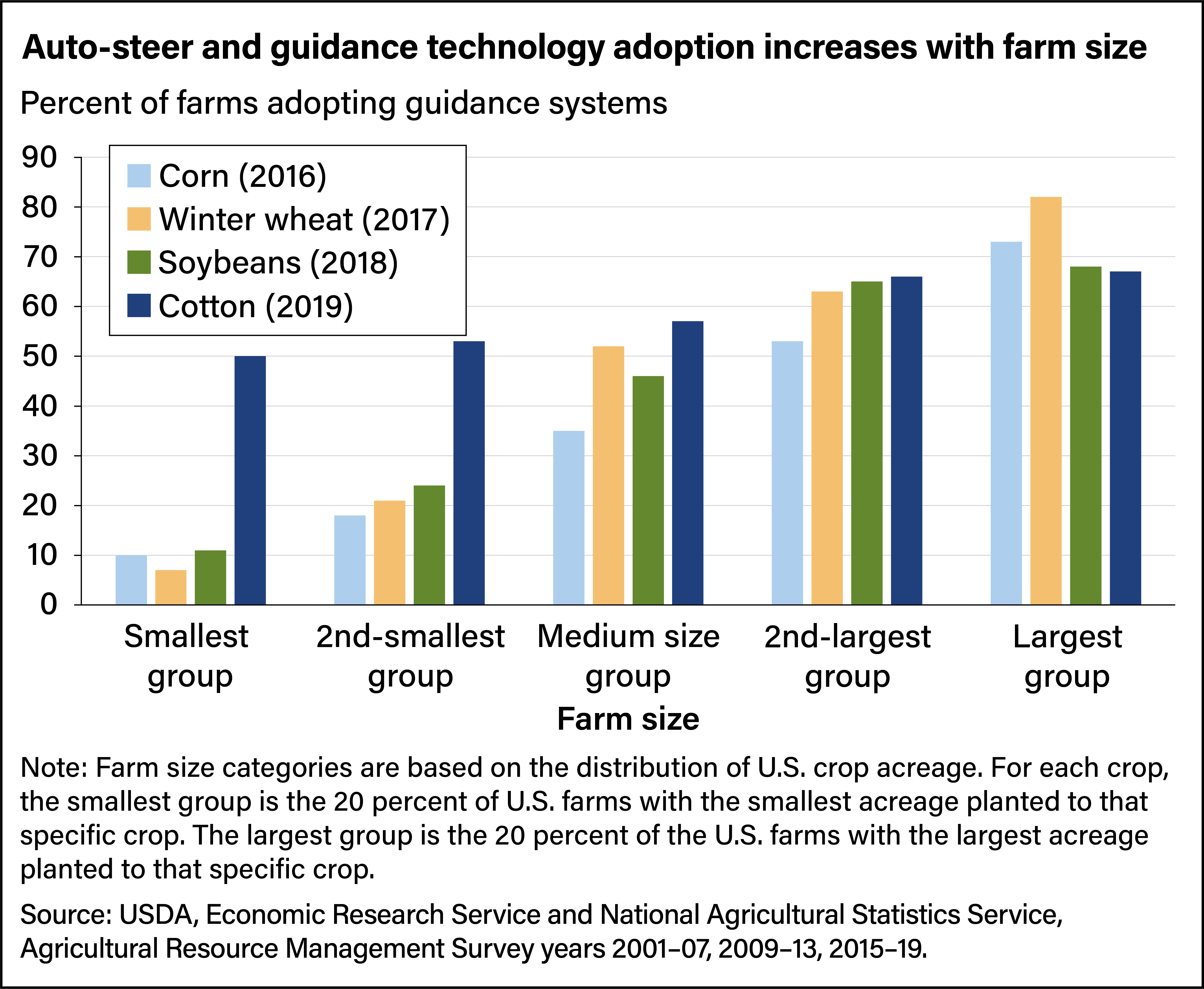 미국농무성USDA의 2023년 4월 자료를 보면 미국 옥수수, 대두, 면화, 겨울밀 재배 면적의 50% 이상이 자동조향 및 안내시스템으로 관리되고 있다고 한다. ers.usda.gov/amber-waves/2023/april/most-row-crop-acreage-managed-using-auto-steer-and-guidance-systems/