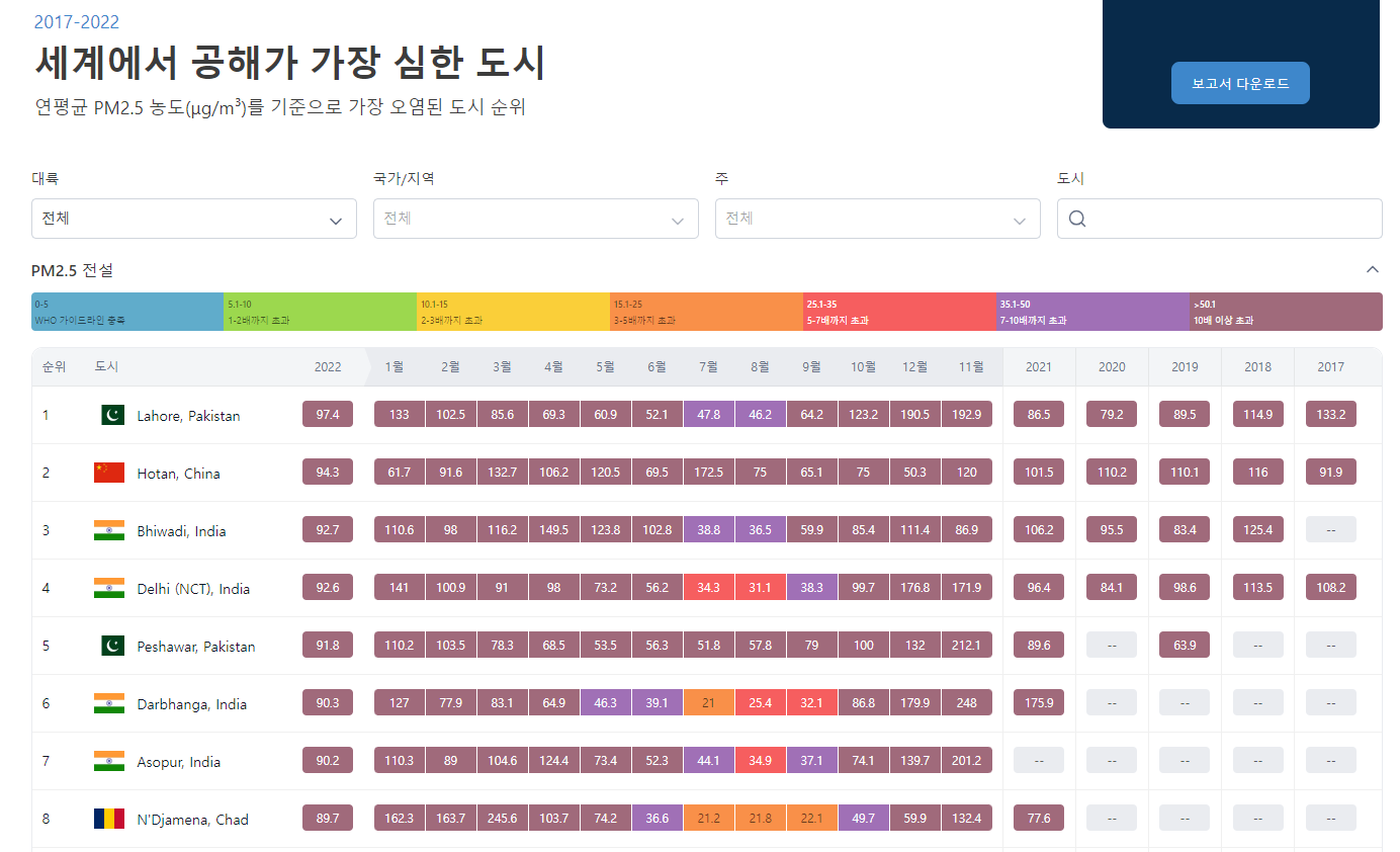 위 웹사이트를 기준으로 24년 3월 15일 현재 공기질이 나쁜 주요도시는 치앙마이, 카트만두, 베이징, 양곤, 다카, 델리, 카라치, 항저우, 하노이, 두바이, 콜카타, 우한 등이다. 도시에서 알 수 있듯이 일부는 공장이 없는 지역으로 건기에 엄청난 화재가 발생하는 지역들이다. 반대로 공기질이 좋은 도시는(나쁜 순위의 역순) 베른, 뮌헨, 런던, 덴버, 마드리드, 밀라노, 브뤼셀 등이다.
