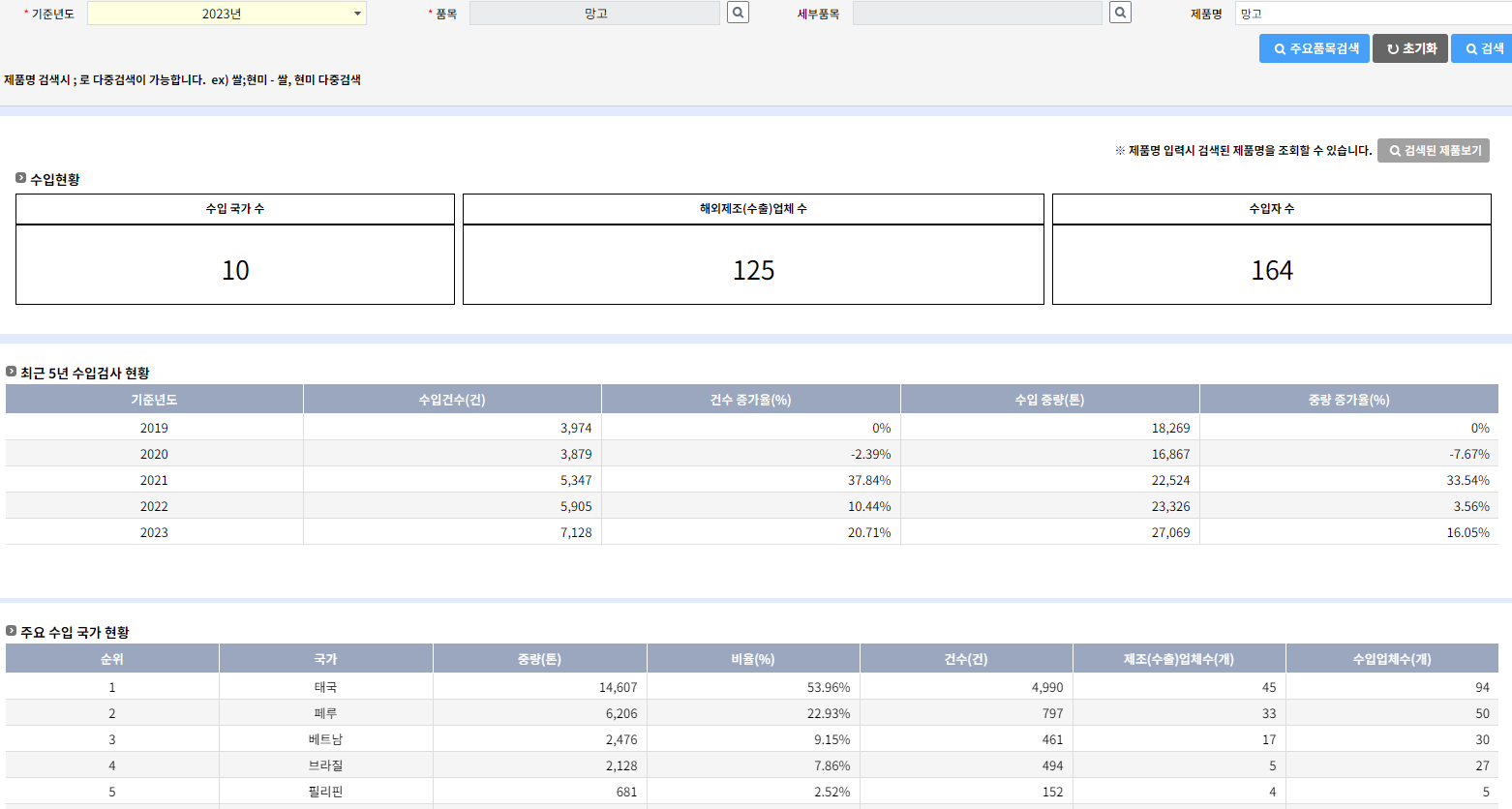 수입식품정보마루에 따르면 2023년 수입한 망고는 총 27,069톤으로 10개국에서 수입됐다. 올해 상반기 할당관세 물량이 왜 14,000톤인지 알 수 있는 부분이다. 태국53.96% 페루 22.93 베트남 9.15 브라질 7.86 필리핀 2.52 대만 2.26 호주 0.75 캄보디아 0.43 https://impfood.mfds.go.kr/ifs/websquare/websquare.html?w2xPath=/ifs/ui/index.xml