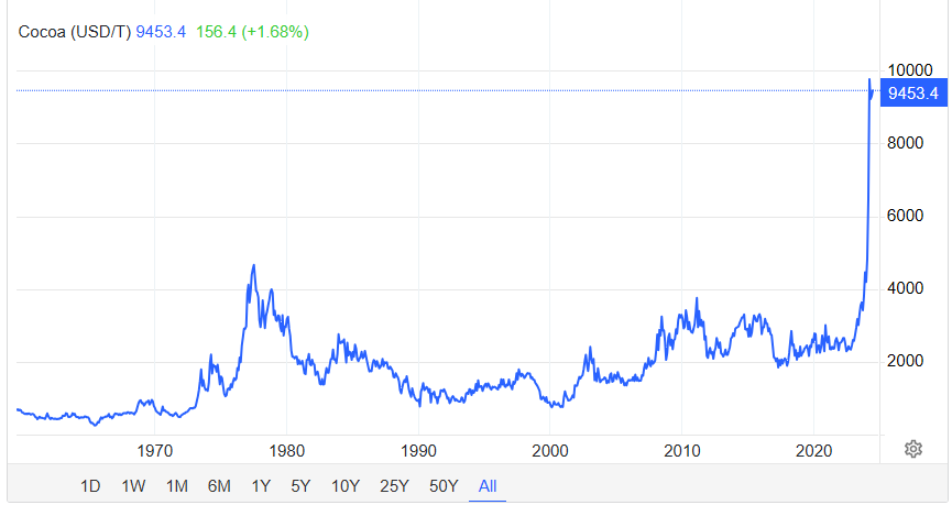 국제카카오협회에 따르면 2024년 4월 19일 일일 거래가격이 톤당 10,966.97달러로 사상 최대치를 기록했다. 그 이후 가격은 조금씩 하락하여 5월 31일 기준 8,626.96달러가 됐다. 불과 1년 전인 2023년 5월 31일에는 2,940.97달러로 1년 사이 2.9배가 상승했다.