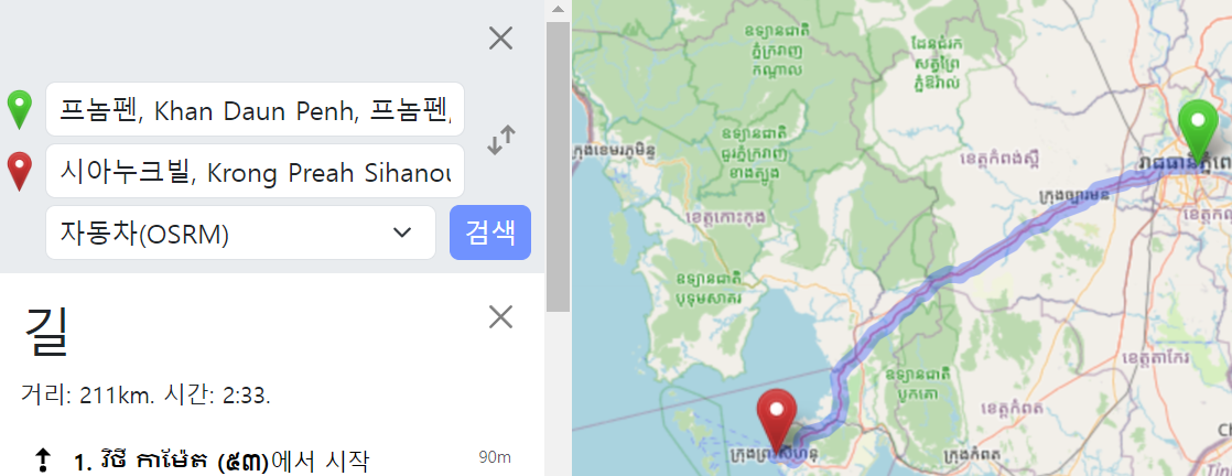 프놈펜에서 시하눅빌 여객항까지는 비락분탐의 VIP밴과 뚝뚝을 탔다. Virak Buntham Tourist Express(VTE)의 12인승 벤츠승합차는 1인당 15달러로 휴게소에 들리는 시간을 포함해서 3시간이 걸린다. 시하눅빌 여객항 인근 차고지에서 하차를 해서 뚝뚝을 타고 시하눅빌 여객항으로 이동했다.