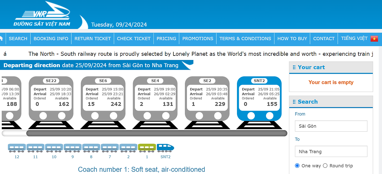 호치민에서 냐짱까지는 4인용 침대칸, 냐짱에서 호치민까지는 Soft Seat를 선택했다. 침대칸은 윗층에만 충전할 수 있는 콘센트가 하나 있다. 각 좌석에는 조절 가능한 조명이 있다. 화장실은 각 객차 끝에 양쪽에 하나씩 있다. 침대는 낡고 깨끗하지는 않지만 베개와 이불을 하나씩 준다. 에어콘이 너무 강하기 때문에 긴옷이나 담요를 챙기는게 좋겠다.