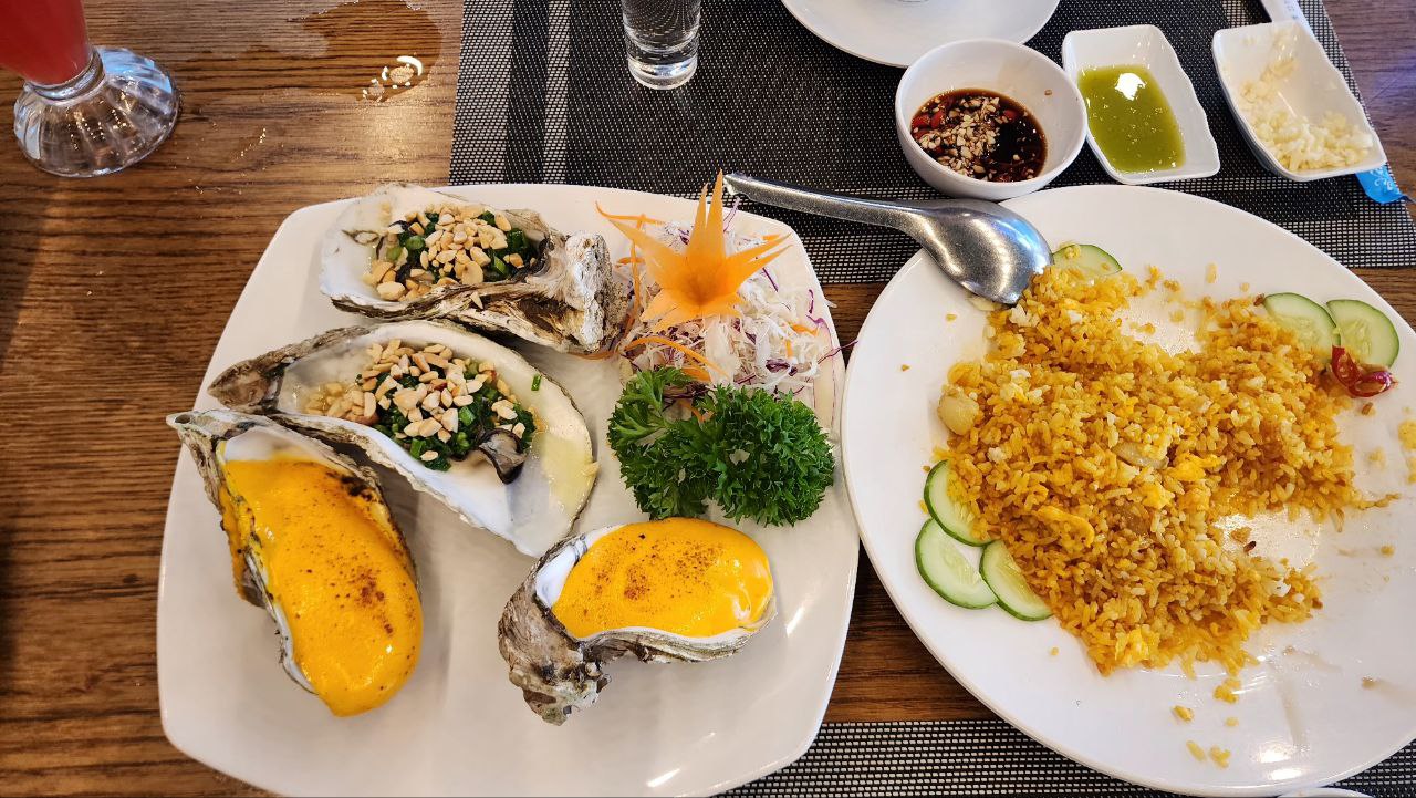 1) Mai huanng 식당 : 해산물 가격은 적당하다 비싸지도 않고 싸지도 않다. 치즈는 너무 싸구려를 써서 추천하지 않는다. 보통은 마늘도 담백한 편인데 여기는 좀 많이 기름지다. 입구에서 내내 담배를 펴서 밥 먹는데 불편했는데 문화적인 차이로 식당에서는 문제점인지 전혀 모르는 것 같다. 외부 술 반입이 가능해서 하노이보드카 한병을 마트에서 사왔다. 식당에서 배경음악으로 마사지집에서나 틀어주는 음악을 틀어주던데 그나마도 뚝뚝 끊겨서 신경에 거슬렸다. 물론 손님이 많아서 북적거릴 시간에 가면 크게 문제는 안될 수도 있겠다.