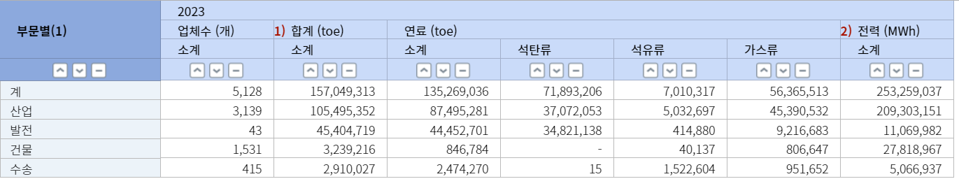 출처 : 산업통상자원부,「에너지사용량통계」, 2023, 2024.10.12, 부문별 에너지원별 소비실적 https://kosis.kr/statHtml/statHtml.do?orgId=115&tblId=DT_11507N_201&conn_path=I2