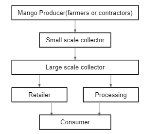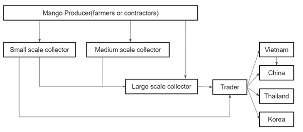 망고를 재배하는 농민들은 직접 망고를 생산하기도 하지만 5년차 이상의 성목이 된 경우 계약자들이 이들 망고를 계약재배생산하기도 한다. 수출업자나 가공업체는 규모에 따라 차이는 있지만 10톤, 20톤 단위로 망고를 매입, 운송하기 때문에 소규모 농가에서는 직접 납품하기 어려운 구조를 가지고 있다. 따라서 중간 수집상은 농민이나 계약 재배자로부터 망고를 매집하여 다음 단계의 수집상 또는 가공공장에 판매한다. 육로를 통한 인접국으로의 수출은 수집상이 매집하여 중개업자를 통해 수출하게 된다. 한국, 중국 등 검역이 필요한 경우 수집상을 통해서 매집된 망고를 검역장에서 처리한 후 서류작업을 거쳐 수출하게 된다.