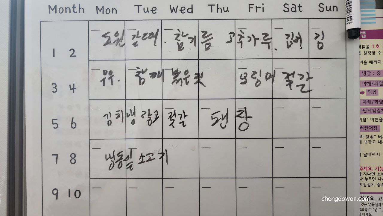 언제부터인지는 모르겠지만 10년은 족히 지난 것 같다. 달력에 써야할 일정이 줄어든 대신 냉장고 옆에 작은 메모판이 붙었다. 여기에는 남들에게 적극적으로 보여주고 싶은 않은 일정들이 있는데 달력에 들어갈 내용처럼 반복적이지는 않지만 단기간 내에 처리해야 할 일들이 적혀있다. 병원에 다녀와서 처방약이 생기면 약을 언제 먹어야할지 약국에서 들은 설명을 큰 글씨로 옮겨 적는다. 내가 가끔씩 집에서 가서 이번에 챙겨 달라고 부탁한 것들을 또 큰 글씨로 적어서 잊지 않게 한다. 달력은 거실에 있어 누구나 볼 수 있지만, 이 메모판은 냉장고 옆에 붙어 있어서 눈 높이가 엄마와 정확히 맞아야 하고 지나가면서 굳이 냉장고의 구석진 한 면을 봐야지만 알아챌 수 있다. 이 메모판은 언제든지 지우고 다시 쓸 수 있다. 아마 내가 출국하고 나서 지우고 김장 일정을 적었으리라.