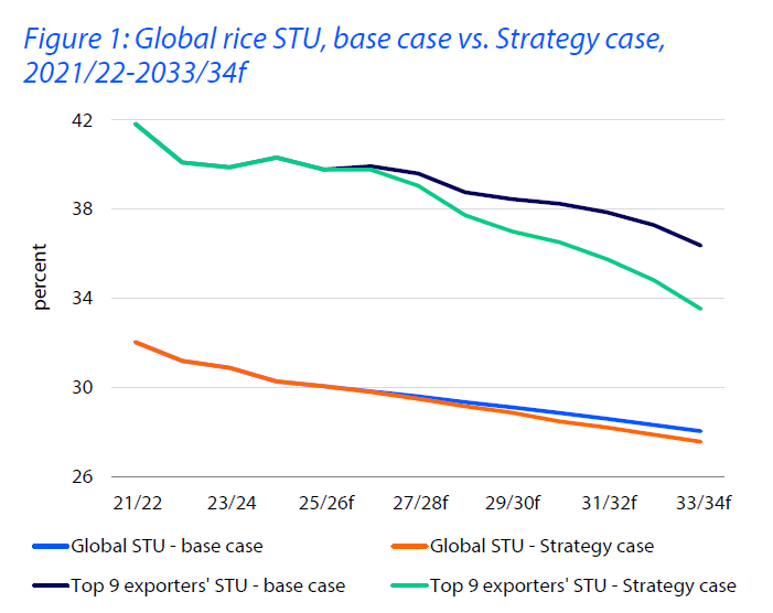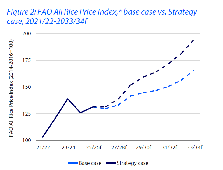 기본 시나리오에서는 상위 9개 쌀 수출국의 총 생산량을 매년 최소 200만 톤 증가시켜야 33/34년 세계 쌀 가격이 23/24년 수준 아래로 떨어질 수 있으며, 13% 하락 가능. 전략 시나리오에서는 상위 9개 쌀 수출국의 총 생산량을 매년 최소 300만 톤(기본 시나리오 대비 50% 더 증가)증가시켜야 되며 9% 하락 가능