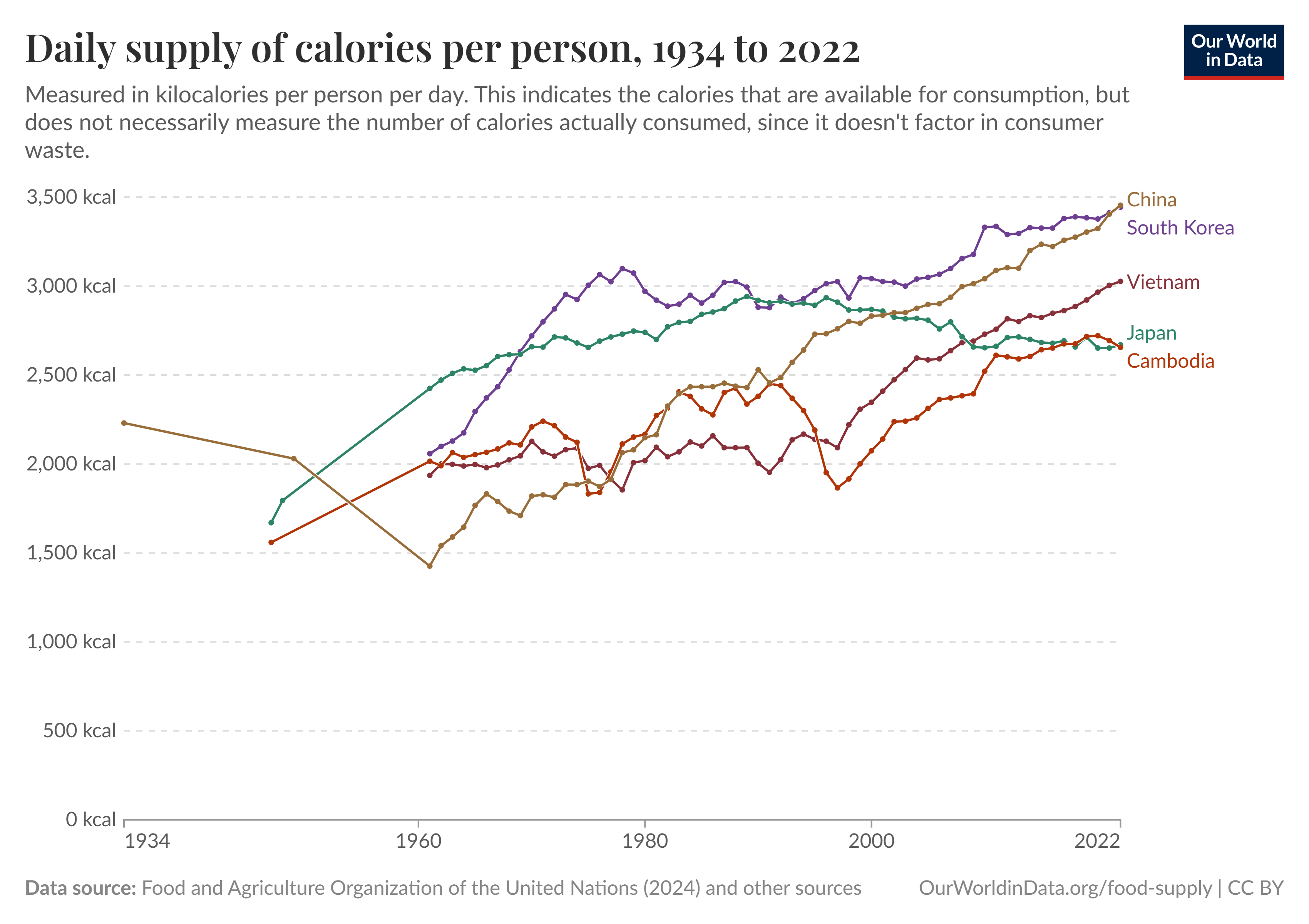 K-Food의 세계적인 인기로 한식의 대중화가 많이 이뤄졌다. 한식당에서 밥을 먹고 난 뒤와 현지식당에서 밥을 먹고 난 뒤에 시간이 지나고 느끼는 공복감이 가끔 다를 때가 있다. 기본적으로 인디카 쌀은 찰성이 적어 소화가 빨리 되기고 하고, 우리나라 식단은 열량이 높은 편이다. 게다가 우리는 채소 소비량도 많은데 한중일캄베의 채소 소비량을 비교해 보자.