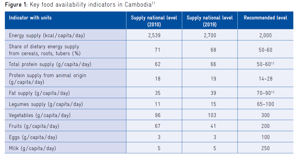1) 캄보디아도 기후위기에 취약한 국가지만 식량 문제는 조금 다르다. 주식이 쌀이면서 남아도는 쌀이 많아 100만 톤까지 수출 가능하다고 보고 있다. 열량을 채우기 위한 식량 공급에는 큰 제약이 없으나, 식단의 60%가 쌀에 치우쳐 있어, 과일 채소 동물성 식품 섭취가 권장량에 못 미친다. 특히 가임기 여성(15~49세), 만 2세 이하 영유아, 소규모 농민 등이 취약계층이다.