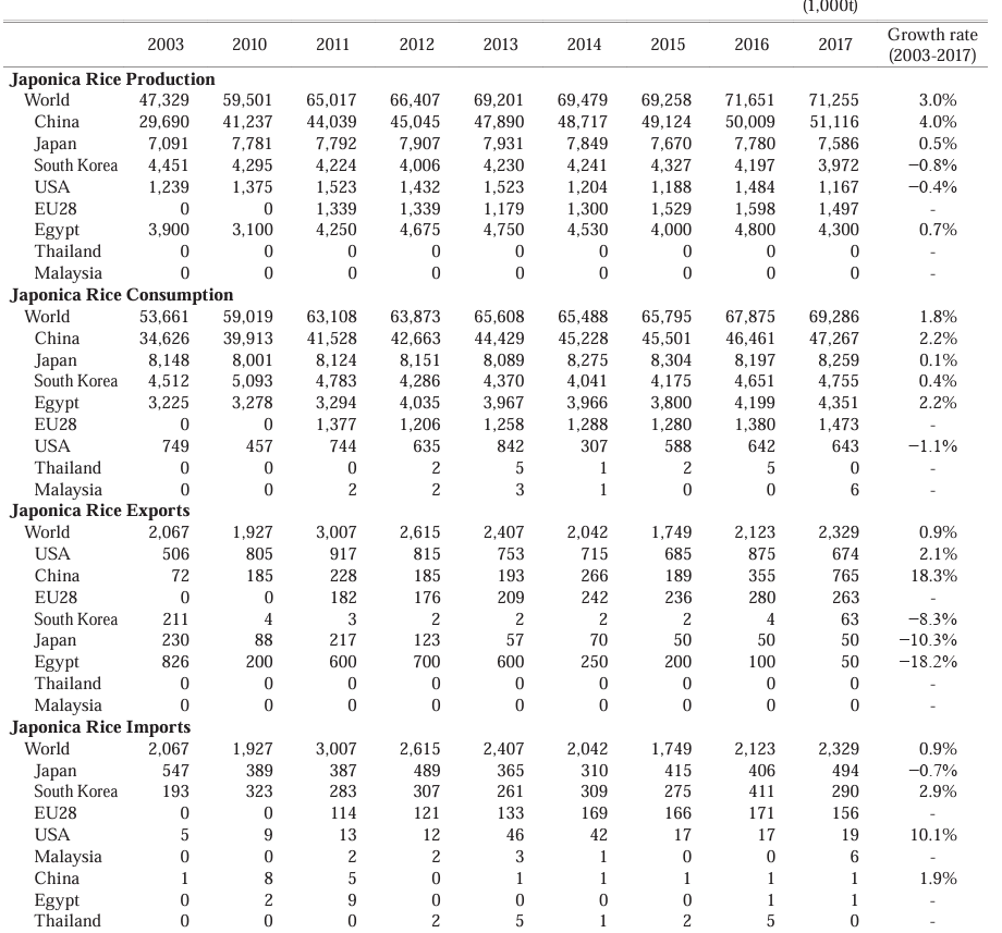 Global Rice Market Projections Distinguishing Japonica and Indica Rice under Climate Change(Tatsuji KOIZUMI* and Gen FURUHASHI, 2020)을 보면 2017년 자포니카 쌀 생산은 세계 71,255천톤 중국 51,116천 톤 일본 7,586천 톤, 한국 3,972천 톤 미국 1,167천 톤 EU 1,497천 톤 이집트 4,300천 톤이다. 소비는 세계 69,286천 톤 중국 47,267천 톤 일본 8,259천 톤 한국 4,755천 톤 이집트 4,351천 톤 EU 1,473천 톤 미국 643천 톤이다. 같은 해 인디카 쌀의 전세계 생산은 417,349천 톤 소비는 412,077천 톤이다. 생산규모로 보면 자포니카는 인디카 쌀에 비해 17%에 그친다.