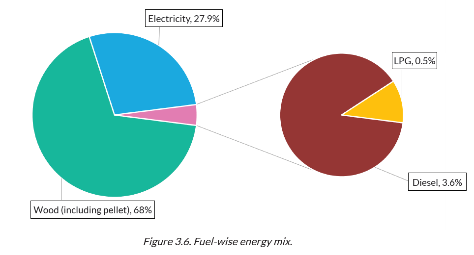 에너지 사용 총량으로 보면 연간 20,009 toe의 에너지가 사용되는데, 68%에 해당하는 13,609 toe가 목재로부터 나온다. 전기는 두번째 많이 사용되는 에너지로 28%이다. * 1toe = 4MWh = 10^7 Kcal = 원유 1톤의 열량