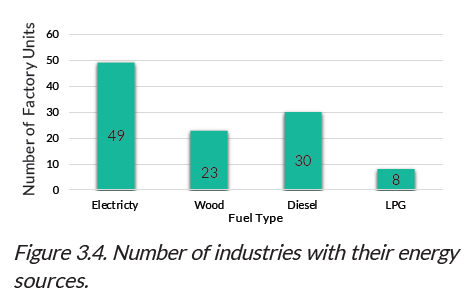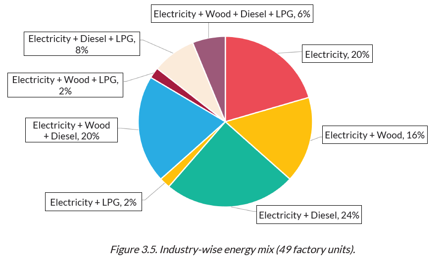 봉제산업에서는 전기, 경유, 목재를 주로 사용하고 취사용으로 LPG를 사용한다. 이들 에너지를 혼합해서 사용하는데 전기는 가장 많이 사용되는 에너지로 98%에 해당하는 공장이 사용중이고, 그 다음으로는 목재를 사용하는 공장이 46%이다. 전기는 주로 생산설비와 보조설비에 사용하고 목재는 보일러 가동에 사용된다. 디젤 사용량은 많지 않은데 발전기와 지게차에 사용된다.