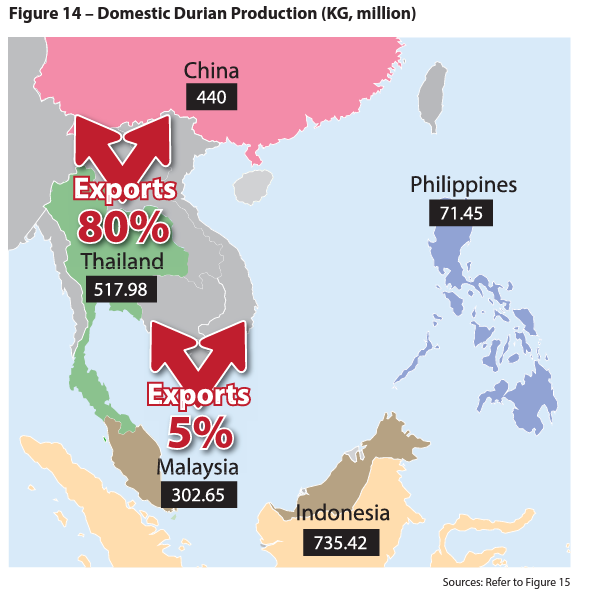 태국과 말레이시아는 전세계 두리안의 90%를 생산한다. 2016년 기준 태국은 60만톤, 말레이시아는 40만톤을 생산했고 필리핀은 7만1천을 생산했다. 태국은 대부분 수출하고 말레이시아는 대부분 내수로 사용되는 것이 특징이다. 대부분의 두리안은 중국에서 수입한다. 2) 중국 66%, 베트남 19%, 홍콩 4% 싱가폴 4% 기타 6%(참고문헌 7)