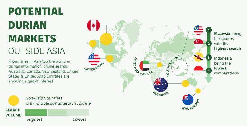 2016년 세계 두리안 수요는 15억 kg으로 약 150억불에 달한다. 총 생산량 중 29.84%가 수출되고 70.16%는 내수 소비된다. 국별 수요량을 보면 태국 100,834,000kg 말레이시아 348,379,000kg 인도네시아 585,735,000kg 이다. 국별 인당 수요량(kg)을 보면 말레이시아 11 대만 3.2 싱가폴 3.18 브루나이 3.09 인도네시아 2.4 홍콩 2.31 태국 1.46 마카우 1.37 베트남 0.92 중국 0.21 등이다. 하지만 중국은 인당 수요가 계속 증가하여 2030년에는 1.11kg 달할 것으로 전망된다.