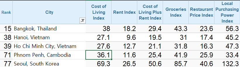 여러 글에서도 썼지만 1:1로 비교하기는 어렵지만 대표적인 물가지표 비교 사이트인 Numbeo를 기준으로 비교하면 서울과 비교해서 호치민의 물가지수는 40% 수준으로 나타난다. 캄보디아는 서울의 52% 수준으로 나온다. 외식물가와 식자재 가격을 감안하면 까오방지역은 하노이보다 종합적으로 낮은 생활비가 될 수 있을텐데, 낮은 인건비로 인해 외식물가가 많이 싸거나 고급식당이 부족하기 때문으로 해석할 수 있다.