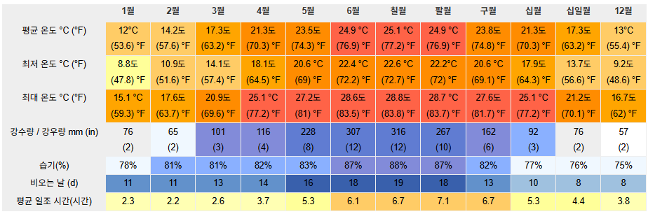 일상생활에서 중요한 것은 강우량 만큼이나 강우횟수와 습도가 중요하다. 비가 얼마나 자주 오는지가 야외활동이나 빨래!! 할 수 있는 시간을 결정하기 때문이다. 표를 보면 6-9월 일평균 일조시간이 6-7시간이다. (우리나라는 연평균 6.4시간 https://www.mal-eum.com/sun) 나머지 날은 2-3시간인데 산악지형이어서 해가 짧거나 강우일수가 많아서 구름 때문으로 보인다. 짧게 있어 본 바로는 두가지 모두 해당될 듯 하다. 습도가 70-88%이다. 이 둘을 종합하면 야외활동할 때 매우 습해서 땀이 많이 나고 짜증도 많이 나면서, 빨래가 잘 마르지 않을 듯 하다. 한국인 기준으로 단기 여행은 덥지 않고, 습하지만 그늘에서는 더위를 피할 수 있어 쾌적할 수 있으나, 장기체류는 일상생활과 빨래 등의 문제로 상당히 스트레스 받을 수 있겠다.