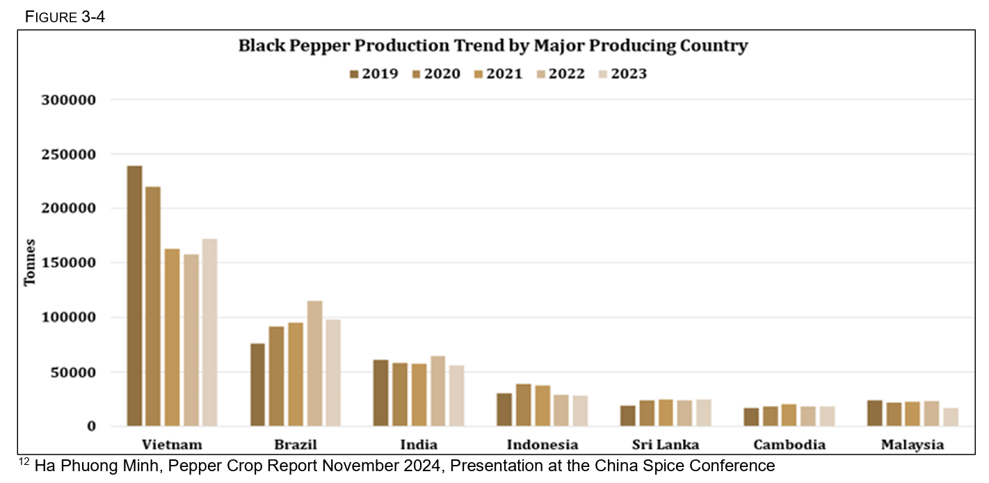 전세계 후추생산량 중 캄보디아는 2018년 4.8%로 최고점을 찍었고 2023년에는 4.25%였고 2024년에는 3%로 하락했다. 지금의 시장상황은 캄보디아 후추생산량을 늘릴 수 있는 기회가 된다. 캄보디아는 베트남 인도네시아 말레이시아 등 후추 생산 상위권 7개국에 속하는 국가들과 인접해 있다. 특히 브라질을 제외하고 전세계 검은후추 생산의 75%를 차지하는 지역에 속해있다. 또 후추 소비의 60%도 같은 지역에서 이뤄진다.