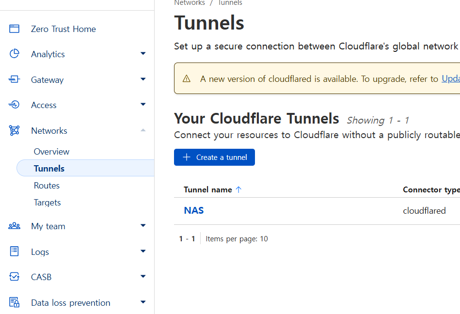 그럼 기본적으로 vpn 상태인 나스를 테일스케일이 없는 기기와는 어떻게 연결할 것인가. 바로 cloudflare의 tunnel이 있다. cloudflare의 tunnel을 등록하고 나스도 설치를 한다. 그리고 토큰을 발급받아서 설치하면 끝난다.