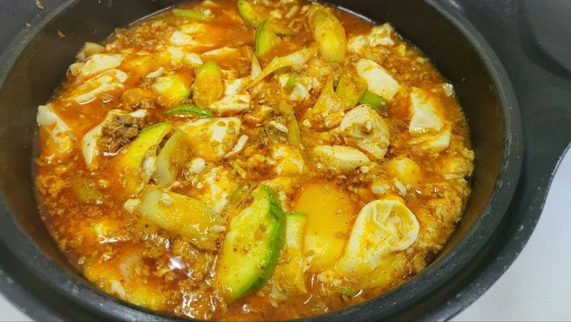 5. 두부가 한번 완전히 끓으면 달걀을 넣고 반쯤 익힌다.