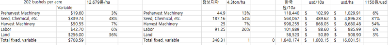 미국의 장비대는 10%, 캄보디아는 20%, 우리나라는 60%인데 우리나라는 위탁영농비를 수확장비대로 합산했기 때문에 높게 나왔다. 물론 이것으로 알 수 있는 것은 미국은 규모의 경제를 통해 장비와 인건비 비중이 낮고, 한국과 캄보디아는 그 반대라는 것이다.
